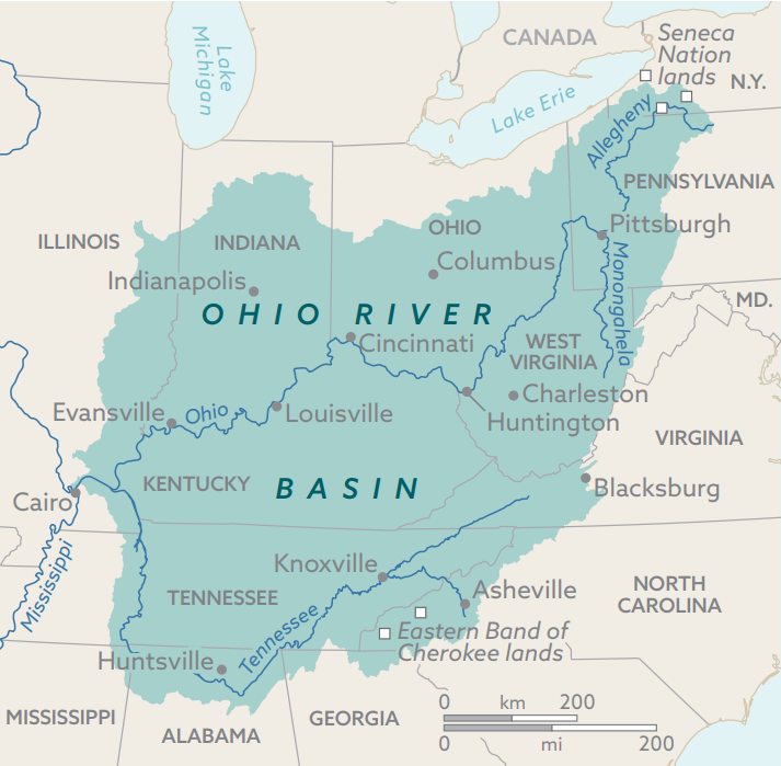 The Ohio River Basin is vast, including portions of Alabama, Georgia, Kentucky, Illinois, Indiana, Maryland, Mississippi, New York, North Carolina, Ohio, Pennsylvania, South Carolina, Tennessee, Virginia, and West Virginia, as well as the Seneca Nation of Indians, and the Eastern Band of Cherokee Indians.